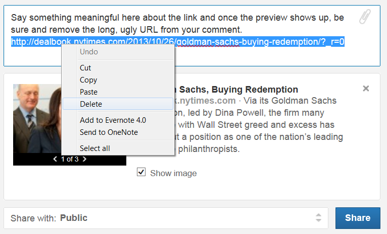 3. If the preview picture is silly, advertising or irrelevant, remove it (deselect the “Show Image” box) and just post the link.  You do not want to confuse people with a picture of dancing dogs next to an article on an IPO.  If there are more than one picture available you will see a selector bar under the picture to scroll through and choose the best and most relevant.